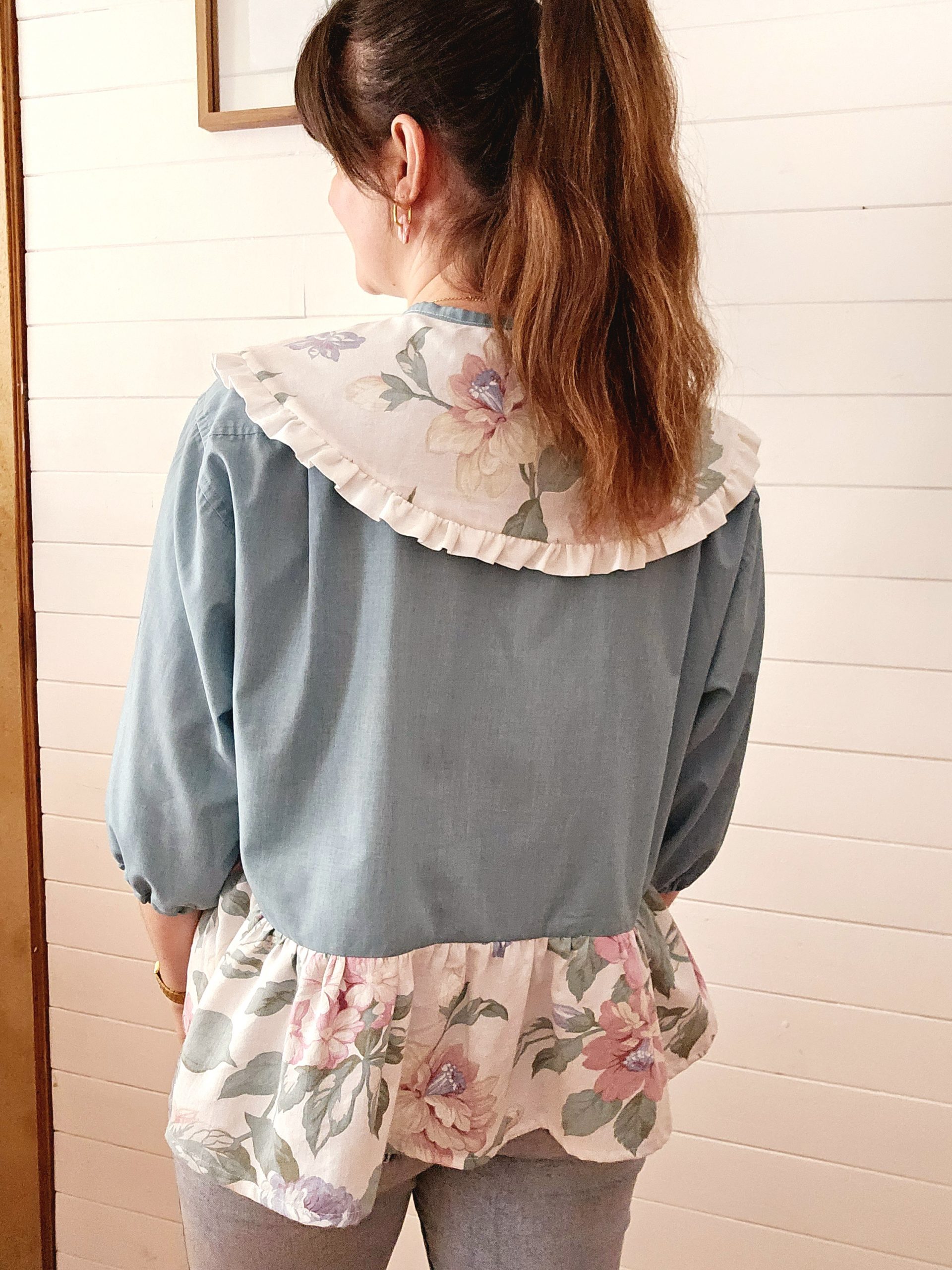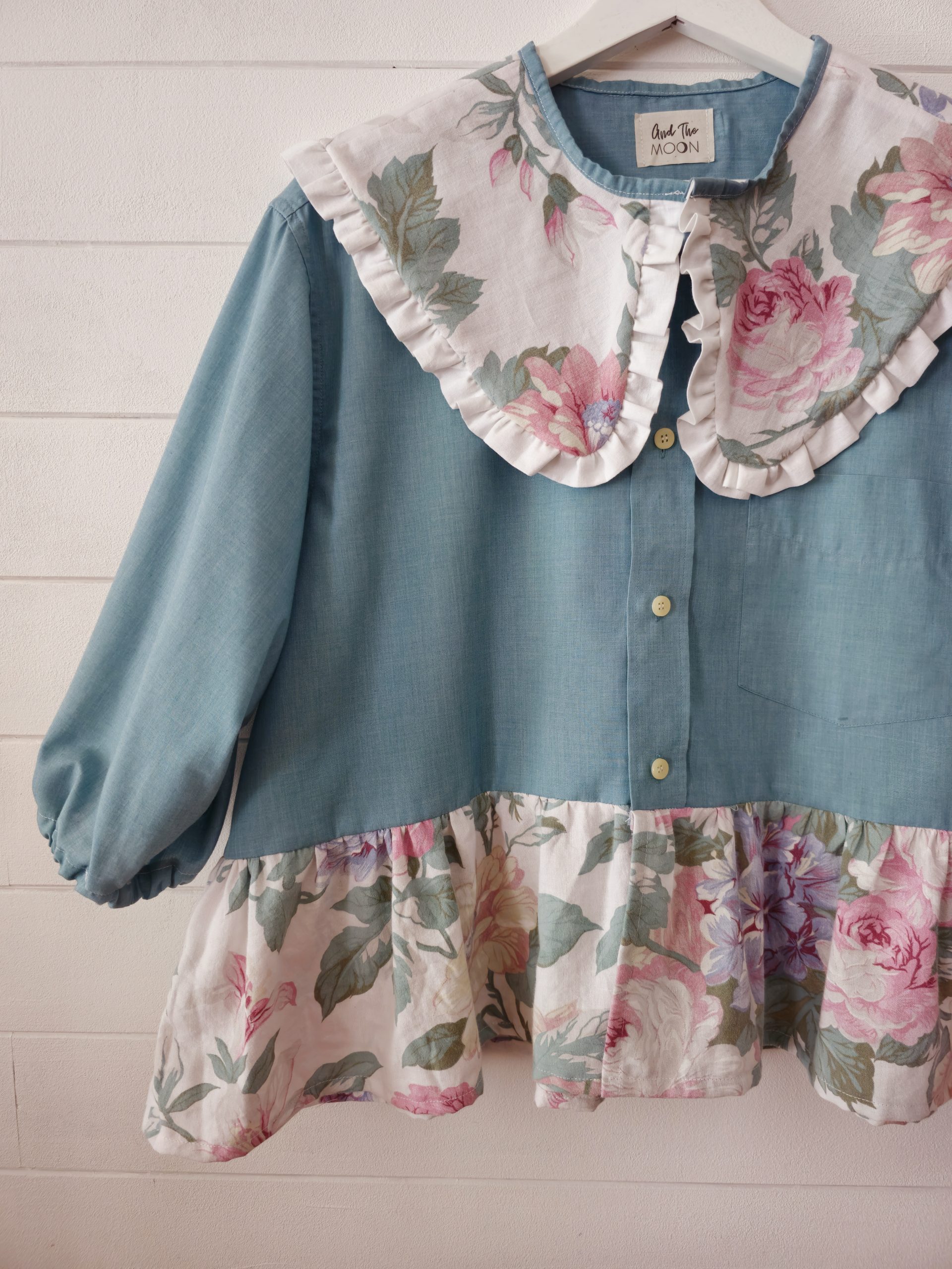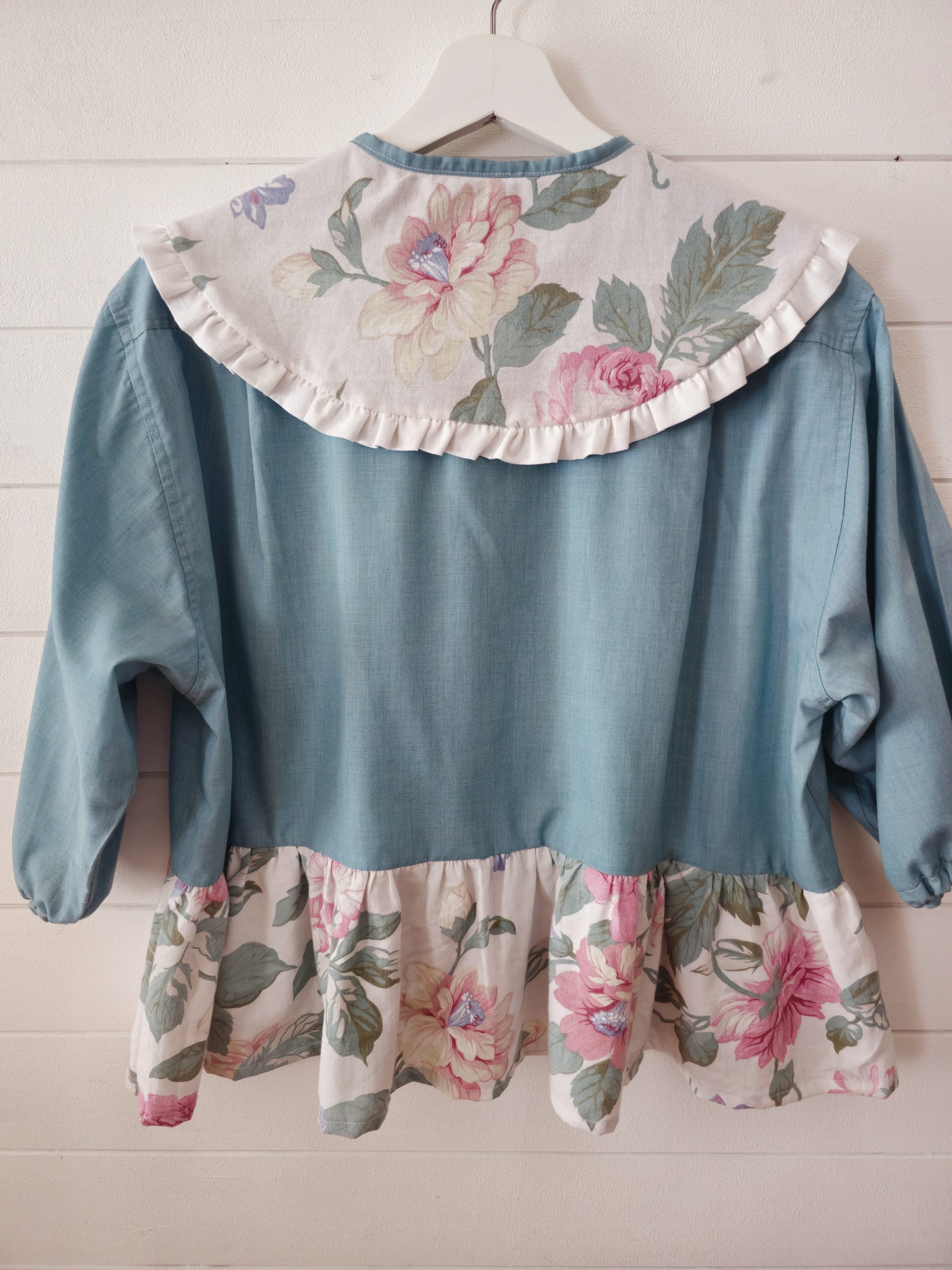 Chemise upcyclés à partir d’une chemise d’homme de seconde main. Coloris vert d’eau . Basques en coton imprimé à fleurs et feuillages. Coupe courte et légèrement over size, se porte avec un pantalon taille haute. Toute petite tâche à peine visible sur le devant de la chemise, dans l’angle bas de la poche plaquée (voir photos).